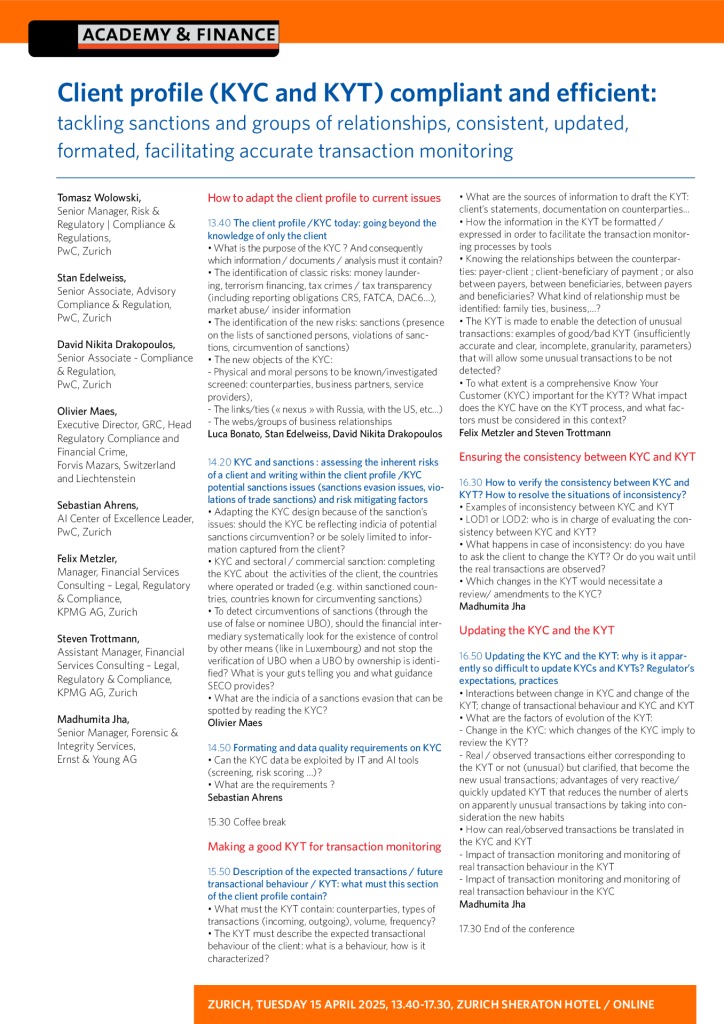Client profile (KYC and KYT) compliant and efficient : tackling sanctions and groups of relationships, consistent, updated, formated, facilitating accurate transaction monitoring